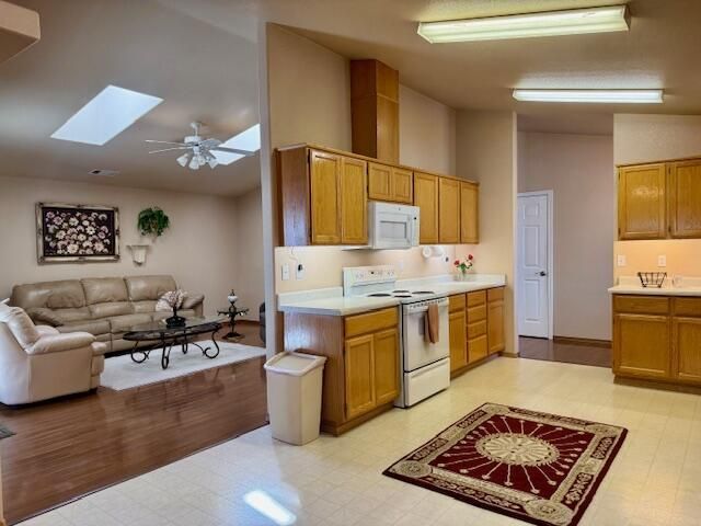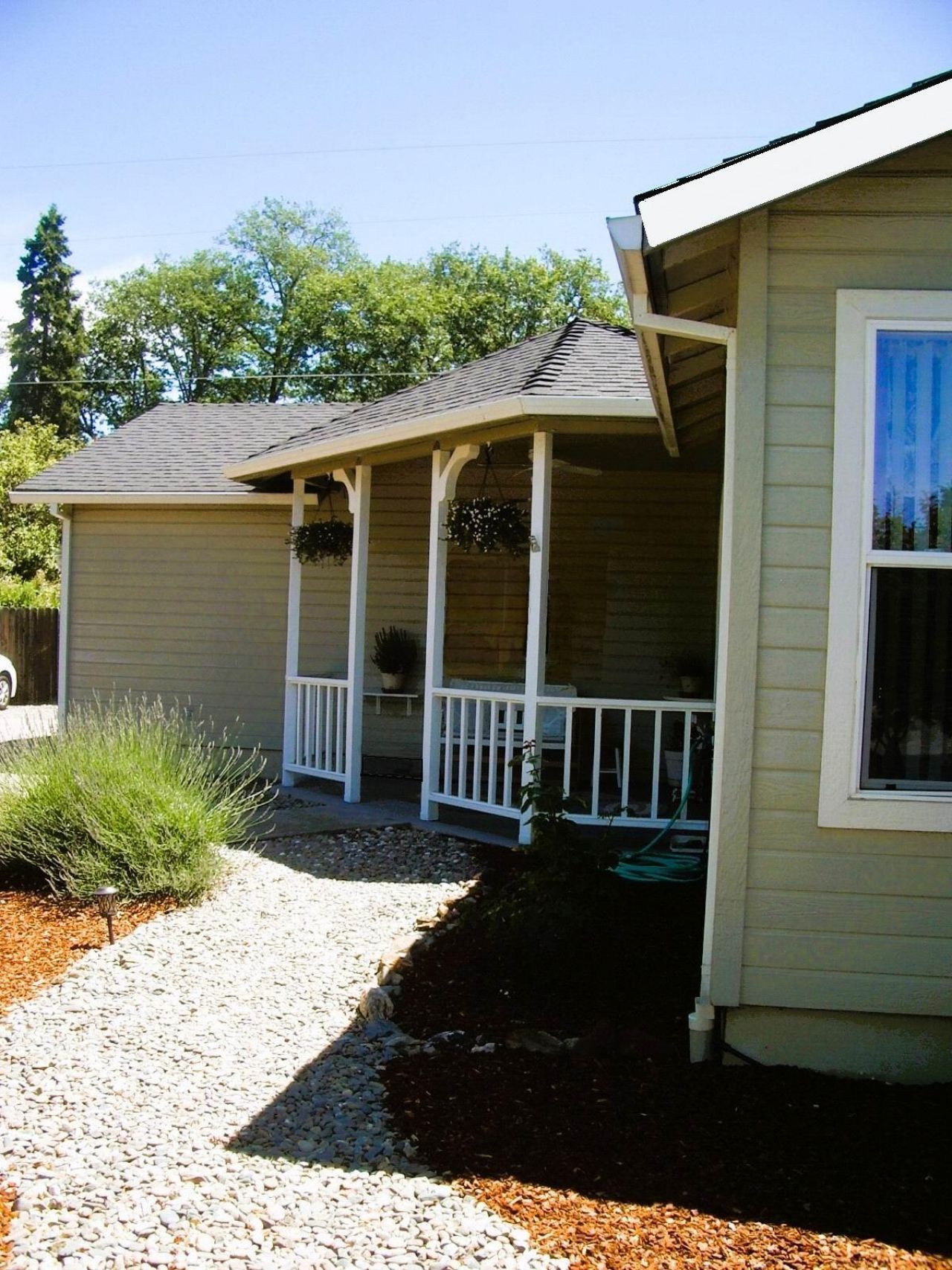 Cozy, immaculate, 1,401 sq ft single-level home featuring 3 bedrooms and 2 full baths in a welcoming neighborhood. Vaulted ceilings in the entry, kitchen, dining, and living room create an open feel, while skylights in the living room bring in additional natural light. The spacious kitchen, with a detached pantry, offers abundant storage and flows into the dining and living areas, ideal for everyday living and entertaining. The primary suite features vaulted ceilings, built-in display ledges, a walk in closet, and a private full bath.Enjoy the inviting front porch with a charming white picket railing, and a back covered patio which spans the full length of the home, each providing great outdoor expanded living space. The low maintenance yard includes a drip irrigation system, mountain views, and raised garden beds. Additional highlights include a two car garage with laundry access, extra parking, and access to a private community park.
